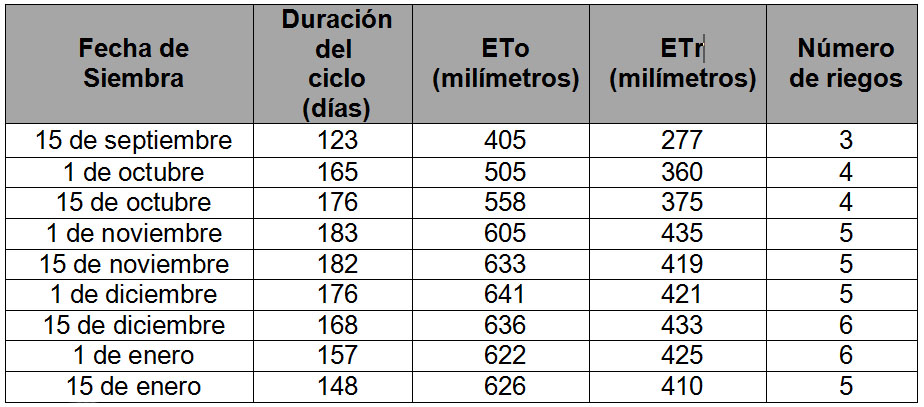 Para el norte de Sinaloa se recomienda sembrar del 15 de octubre hasta el 30 de noviembre. Bajo condiciones normales de disponibilidad de agua en siembras de octubre, los requerimientos hídricos del maíz son 37 cm [3 mil 700 metros cúbicos por hectárea (m3/ha)] y cuatro riegos en total (un riego de asiento y tres de auxilio); para noviembre, son de 42 cm y cinco riegos (uno de asiento y cuatro de auxilio); y para diciembre son mayores de 43 cm, con seis riegos (uno de asiento y cinco auxilios) como se muestra en el Cuadro 1.