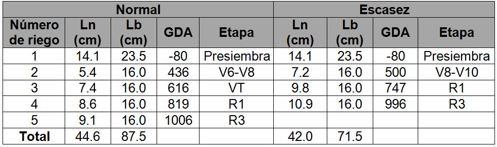 El Cuadro 2 presenta el calendario de riegos para maíz bajo condiciones de escasez comparado con el calendario para condiciones normales, usado en módulos de riego del norte de Sinaloa durante el ciclo otoño-invierno 2002-2003. El rendimiento promedio de la zona no presentó mermas significativas.