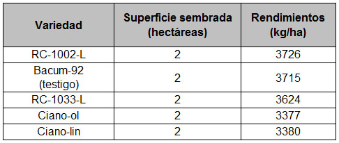 Cuadro 2. Rendimientos de cártamo bajo condiciones de riego en el campo Sinaloa, sembrado el 7 de diciembre de 2010.
