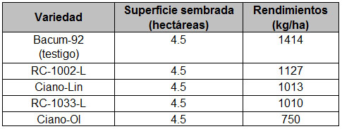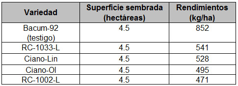 Respecto a la roya, esta se presentó en muy baja escala en los genotipos RC-1033-L, Ciano-Lin, Ciano-Ol; en los genotipos Bacum-92 y RC-1002-L se tuvo presencia de 20 %.