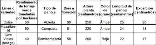 Para el actual ejercicio 2011-2012 se establecieron tres parcelas de validación con dos nuevas líneas sobresalientes, Mazatlán-16 y Dulce, las cuales en el nivel experimental, bajo condiciones de riego, alcanzan rendimientos de 50 t/ha, o más, de forraje verde, y una producción de grano de 5.5 t/ha. En cuanto a su calidad nutritiva de forraje, las variedades Dulce y Mazatlán-16 obtuvieron en promedio para proteína 6.73 y 6.21 %, y en cuanto a digestibilidad 78.09 y 78.66%, respectivamente, por lo que resultan una buena opción para la alimentación del ganado.