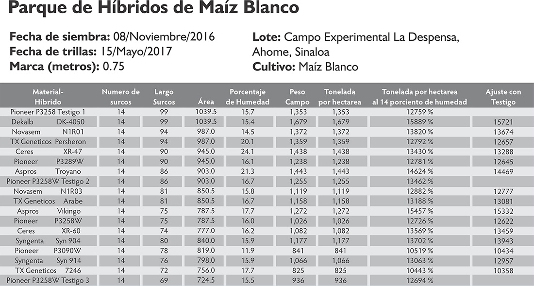 Comentarios: Se observó que en el área del campo experimental de La Despensa, Ahome; donde se estableció un parque de híbridos de maíz blanco tuvieron presencia de la enfermedad Helminthosporium turcicum, siendo el más afectado el P3090W de la marca Pioneer en un 70%, esto se puede deber a las condiciones climáticas del área donde se sembró, el resto de los materiales fue muy poco el daño observado en un rango de 5 al 10%, no llegando afectar drásticamente los rendimientos.