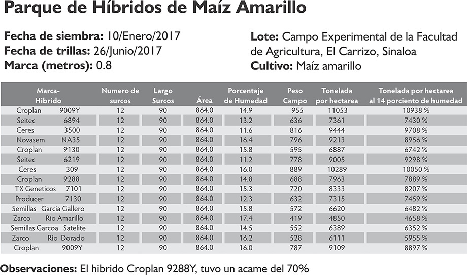 Comentarios: Se observó en el campo experimental de la Facultad de Agricultura, extensión Valle del Carrizo, Ahome. Hibrido de maíz amarillo Croplan 9298Y tuvo un acame de 70%.
