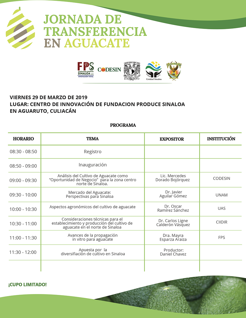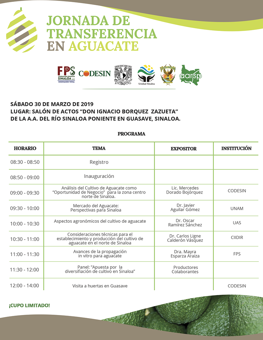 Fundación Produce Sinaloa y el Consejo para el Desarrollo Económico de Sinaloa en colaboración con la UNAM, CIIDIR y UAS llevarán a cabo la Jornada de Transferencia en Aguacate para los productores de Sinaloa, dando a conocer los avances en los trabajos desarrollados por ambos organismos en relación a las buenas prácticas agronómicas, biotecnología y mercados.