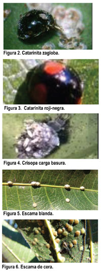 En el norte de Sinaloa se han detectado siete enemigos naturales de escamas: la catarinita Zagloba sp. (Figura 2), la catarinita Azya sp. y la catarinita roji-negra Chilocorus cacti (Figura 3); las crisopas carga basura C. claveri y Ceraeochrysa valida (Figura 4); y los parasitoides Aphytis nr comperei y Encarsia citrina Craw.