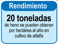 Los mejores genotipos de alfalfa han manifestado un potencial de rendi- miento entre 15 y 20 toneladas por hectárea al año de materia seca (heno).