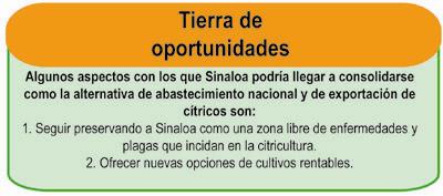 Sinaloa es una región con gran potencial para la producción de cítricos, para el mercado nacional y de exportación, debido a su ubicación geográfica, climas, vocación de suelos, estatus fitosanitario e infraestructura hidroagrícola.