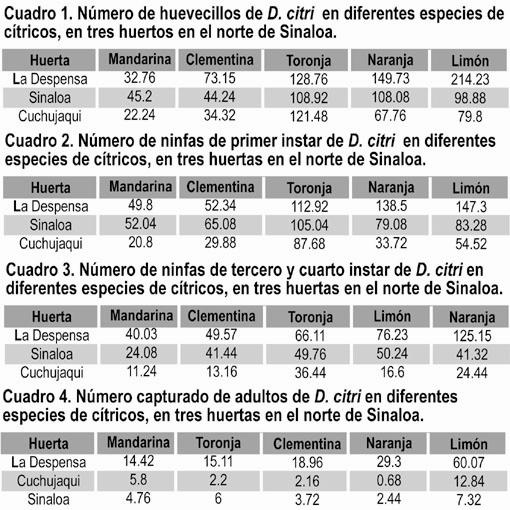 El limón, naranja y toronja muestran mayor incidencia de D. citri, específicamente en la etapa de huevecillo.