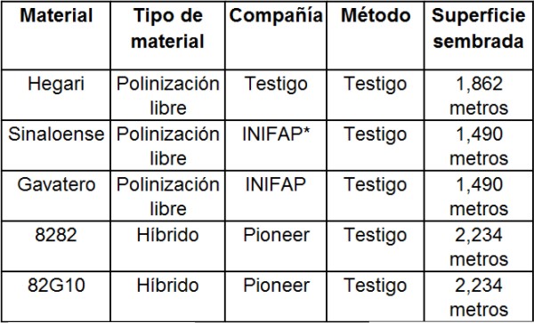 Cuadro 1. Materiales de sorgo establecidos con el método tradicional en Bacamacari, Mocorito, con siembra en julio de 2009.