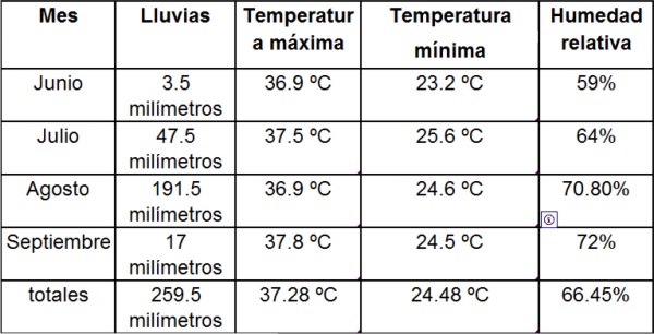 Cuadro 3. Condiciones climáticas durante el desarrollo del cultivo de sorgo en Bacamacari, Mocorito.