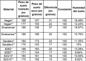 Cuadro 6. Contenido de humedad del suelo en cada material de sorgo con entarquinamiento y práctica tradicional en Bacamacari, Mocorito, en septiembre de 2009.