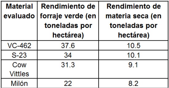 Se espera que la variedad VC-462 rinda 30 toneladas de forraje verde y 9 toneladas de materia seca por hectárea; mientras que para S-23 se prevén 29 toneladas de forraje verde y 8.7 toneladas de materia seca por hectárea; esto frente a las 20 toneladas de forraje verde y 6 toneladas de materia seca por hectárea que actualmente obtienen los productores con Costeño 201.