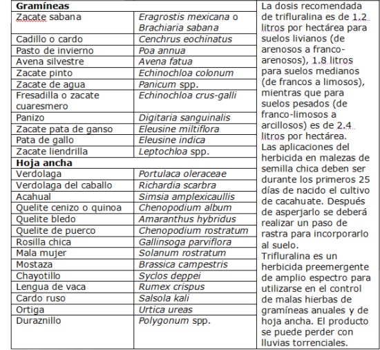 Cuadro 1. Maleza que se evita con el ingrediente activo trifluralina, y dosis de aplicación, de acuerdo al tipo de suelo.