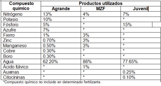 9. Aplicación de fertilizantes foliares. El 19 de agosto de 2009 se realizó una aplicación de 2 litros de Agrande, 2 litros de MZF y 300 mililitros de Juvenil por hectárea (ver composición química de cada producto en el Cuadro 3). Esta fertilización se repitió el 26 de agosto de 2009.