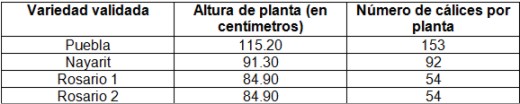 Resultados preliminares del proyecto Validación de cultivares de jamaica con potencial productivo y rentable para las condiciones del sur de Sinaloa indican que de cuatro variedades validadas, hasta enero de 2010 el material Puebla presentaba el mejor desarrollo, con 115 centímetros de altura en planta y 153 cálices por planta. Ver Cuadro 1.
