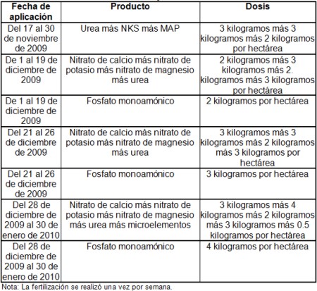 La fertilización al cultivo de jamaica se realizó a través del sistema de riego por goteo; cada semana se utilizó nitrógeno, fósforo, potasio, magnesio, manganeso, boro, fierro y zinc. Las fechas y dosis de aplicación se muestran en el Cuadro 2.