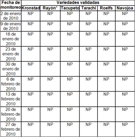 Cuadro 2. Desarrollo vegetativo por variedad en diciembre de 2009, enero, febrero y marzo de 2010.