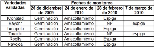 Cuadro 1. Incidencia de roya de la hoja (Puccinia triticina) y roya amarilla (Puccinia striiformis) durante el desarrollo vegetativo del cultivo (enero y febrero de 2010).