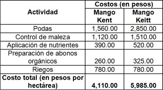 El proyecto Desarrollo del paquete tecnológico para el manejo orgánico de mango en el sur de Sinaloa comprobó que los costos de producción se redujeron tres mil 890 pesos por hectárea en mango Kent, y dos mil 15 pesos por hectárea en la variedad Keitt; comparados con los costos de producción de una huerta de mango con manejo tradicional (ocho mil pesos por hectárea). Ver Cuadro 1.