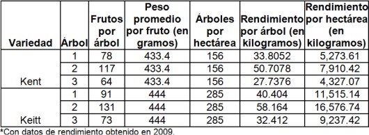La investigación comprobó que utilizando un manejo de producción orgánico, la variedad de mango Keitt presentó el mejor rendimiento (12 mil 443 kilogramos por hectárea), con una densidad de población de 285 árboles por hectárea; mientras que Kent manifestó cinco mil 837 kilogramos por hectárea, con una densidad poblacional de 156 árboles por hectárea. En ambas variedades se utilizó un manejo de producción orgánico. Ver Cuadro 2.