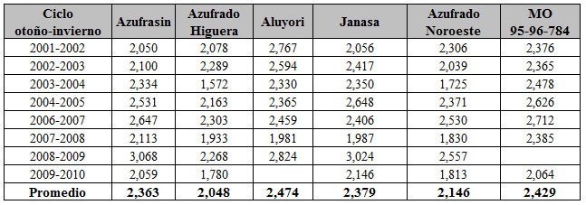 Hay que destacar además, que de 2001 a 2010, se estuvieron analizando los rendimientos de estas nuevas variedades, comparándolas con las de Azufrado Higuera, Azufrado Noroeste y MO 95-96-784; obteniendo éstas, rendimientos de 2 mil 48 kilogramos por hectárea (kg/ha), 2 mil 146 kg/ ha y 2 mil 429 kg/ha, respectivamente. Mientras que las nuevas variedades superaron el rendimiento: Azufrasin 2 mil 363 kg/ha y Janasa 2,379 kg/ ha (ver Cuadro 2).