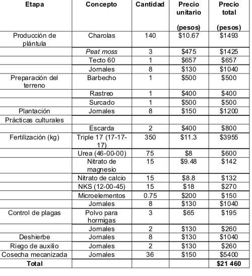 Cuadro 1. Costos de producción para el cultivo de jamaica y costos por hectárea (noviembre de 2011).