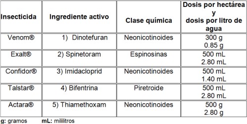 Cuadro. Insecticidas, Ingredientes activos, clase química y dosis de insecticidas evaluados contra D. citri en naranja.