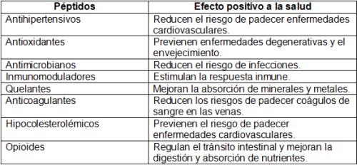 Cuadro 1. Tipos de péptidos bioactivos y sus efectos benéficos en el organismo.