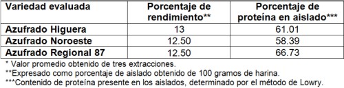 1. Del material Azufrado Higuera se obtuvo un mayor rendimiento de aislado proteínico (13%) que los otros materiales evaluados (Azufrado Regional 87 y Azufrado Higuera). Ver Cuadro 2.