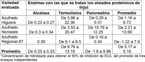 3. Respecto a la actividad sobre la tensión excesivamente alta de la sangre, el mejor valor se obtuvo al tratar los aislados proteínicos de Azufrado Higuera con la enzima alcalasa (0.248 microgramos por mililitro). Ver Cuadro 3. Resulta importante mencionar que entre menores sean los valores más eficaces se consideran, debido a que será necesario consumir una menor cantidad para tener un efecto positivo en el control de la presión arterial elevada.