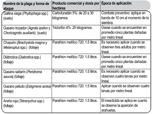 En el Cuadro siguiente se presentan las principales plagas que atacan al cacahuate, producto comercial, dosis por hectárea y época de aplicación.