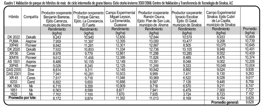 En el norte del estado de Sinaloa, al igual que se ha hecho cada año desde el ciclo otoño-invierno 1998/1999, se realizó la validación de los híbridos comerciales de maíz blanco en diferentes localidades de la región.