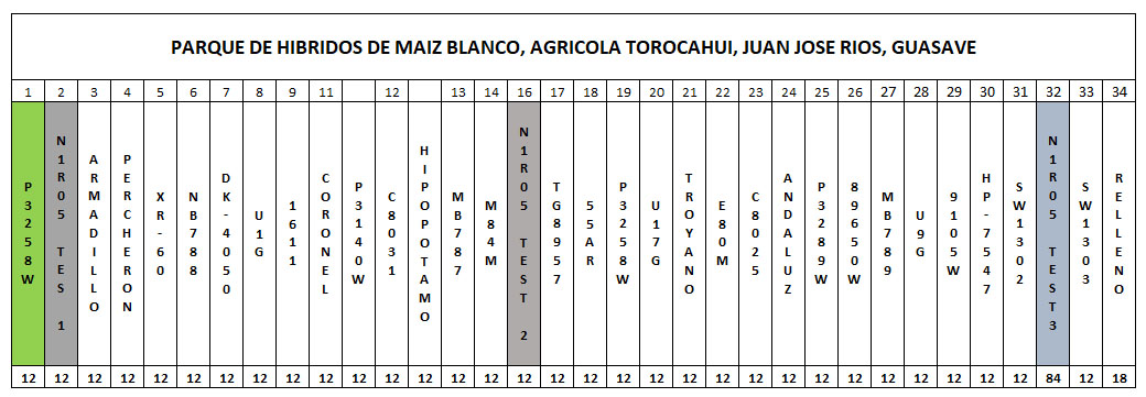 El diseño del parque de híbridos de maíces en la Agrícola Torocahui en Juan José Ríos, Guasave, se estableció de la siguiente manera: