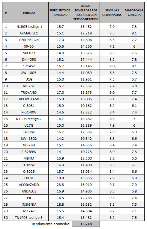 Cuadro 1. Rendimientos por híbrido de maíz blanco, ciclo agrícola 2018-2019.