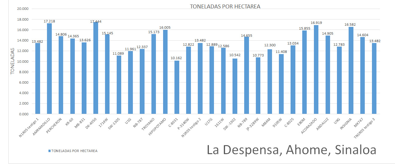 Figura 1. Gráfica de rendimientos por híbridos de maíz blanco, ciclo agrícola 2018-2019.
